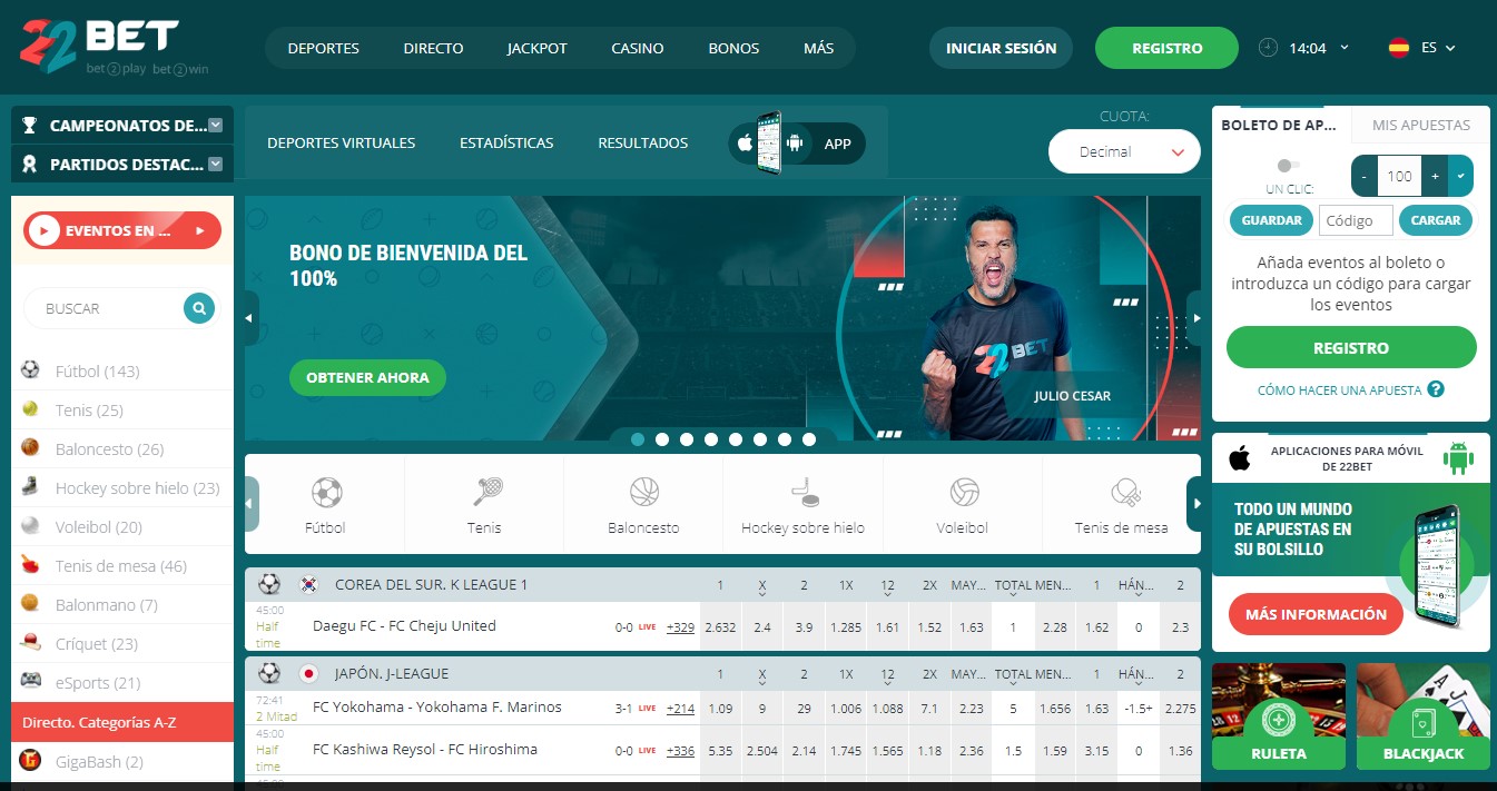 En 22Bet encontrará un montón de oportunidades de apuestas deportivas. Con una amplia gama de deportes y tipos de apuestas, le garantizamos que encontrará exactamente lo que busca. Además de una amplia gama de deportes, este operador también ofrece apuestas sobre política y apuestas en vivo en varios mercados deportivos. Además, no se pierda la exclusiva sección de ciberapuestas deportivas.